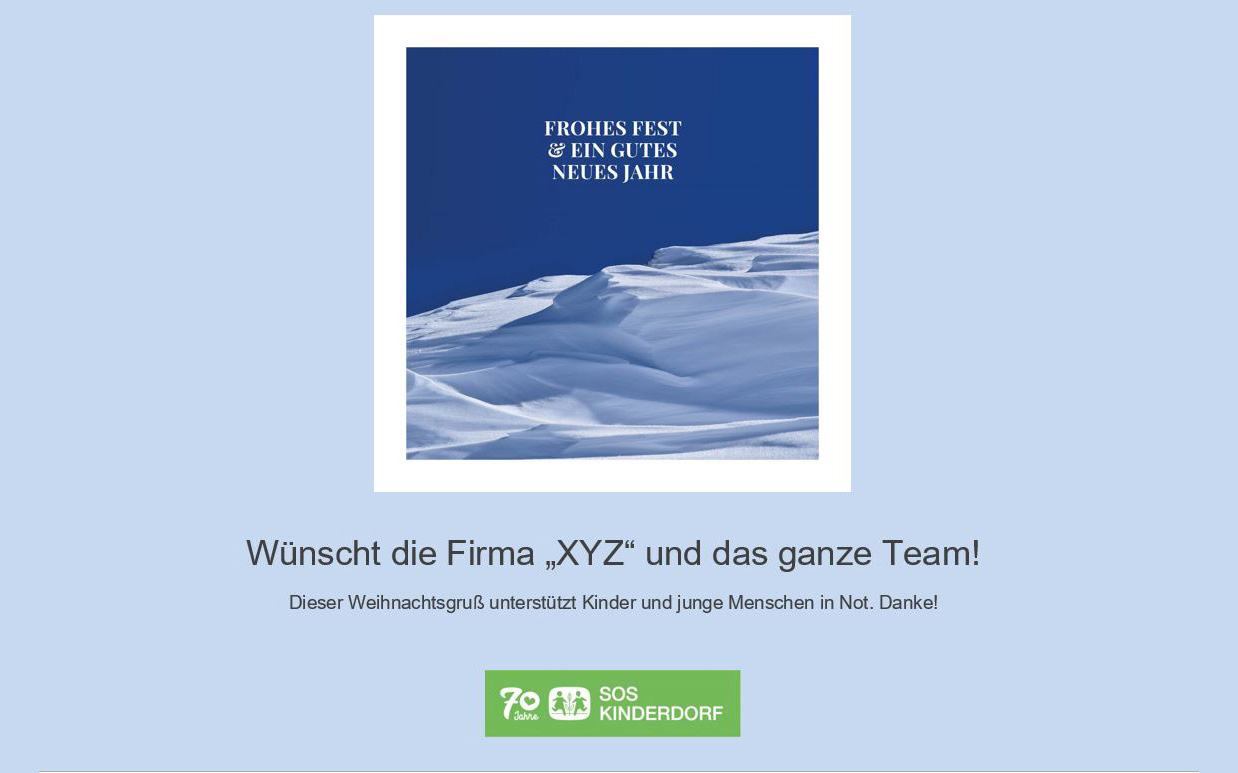 Eine E-Mail Vorlage als Alternative für gedruckte Weihnachtskarten. Schicken Sie Ihren Kund*innen und Firmenpartner*innen winterliche Grüße mit dieser E-Mail. Wir haben vollstes Vertrauen, dass Sie die korrekte Anzahl an geplanten E-Mails auch im Warenkorb berücksichtigen, als Unterstützung für SOS-Kinderdorf. Vielen Dank! Registrierte Kund*innen bekommen nach der Bestellung einen Download-Link für die digitale Karte. Gast-Besteller*innen werden von uns persönlich mit einem Download-Link kontaktiert.